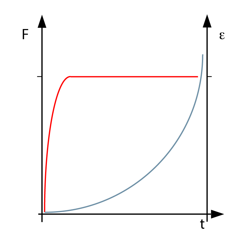 - Bild 3: Darstellung einer Belastung eines Bauteils im Dauerlastversuch. Die blaue Linie stellt die Verformungszunahme und die rote Linie den Kraftverlauf über die Zeit dar.